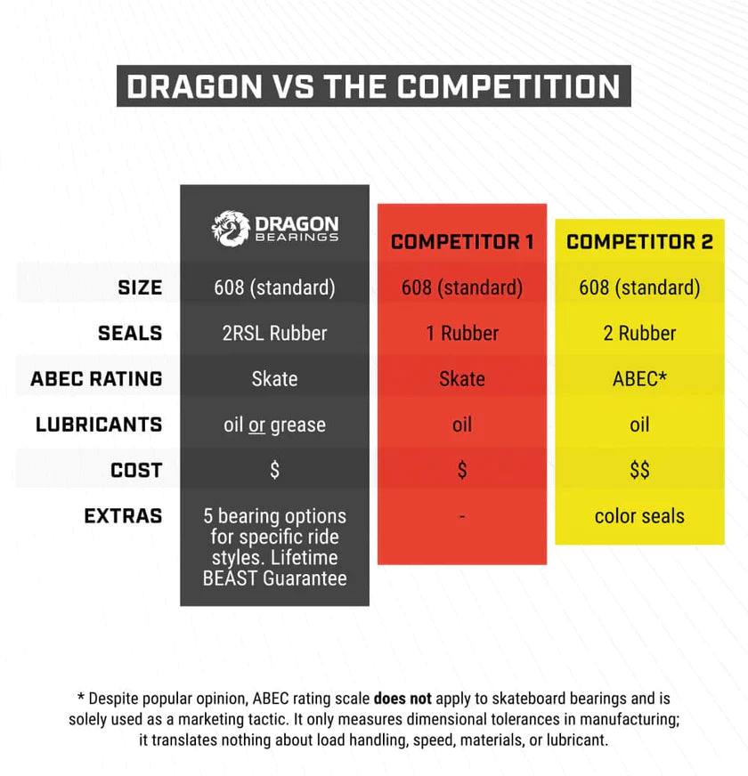 Dragon BUILT Bearings are designed from the ground up for skateboarding and longboarding. Unlike other bearings on the market Dragons' offer Labyrinth shields to help prevent dirt and debris from getting inside the bearing, drastically improving overall performance and life of your bearings.