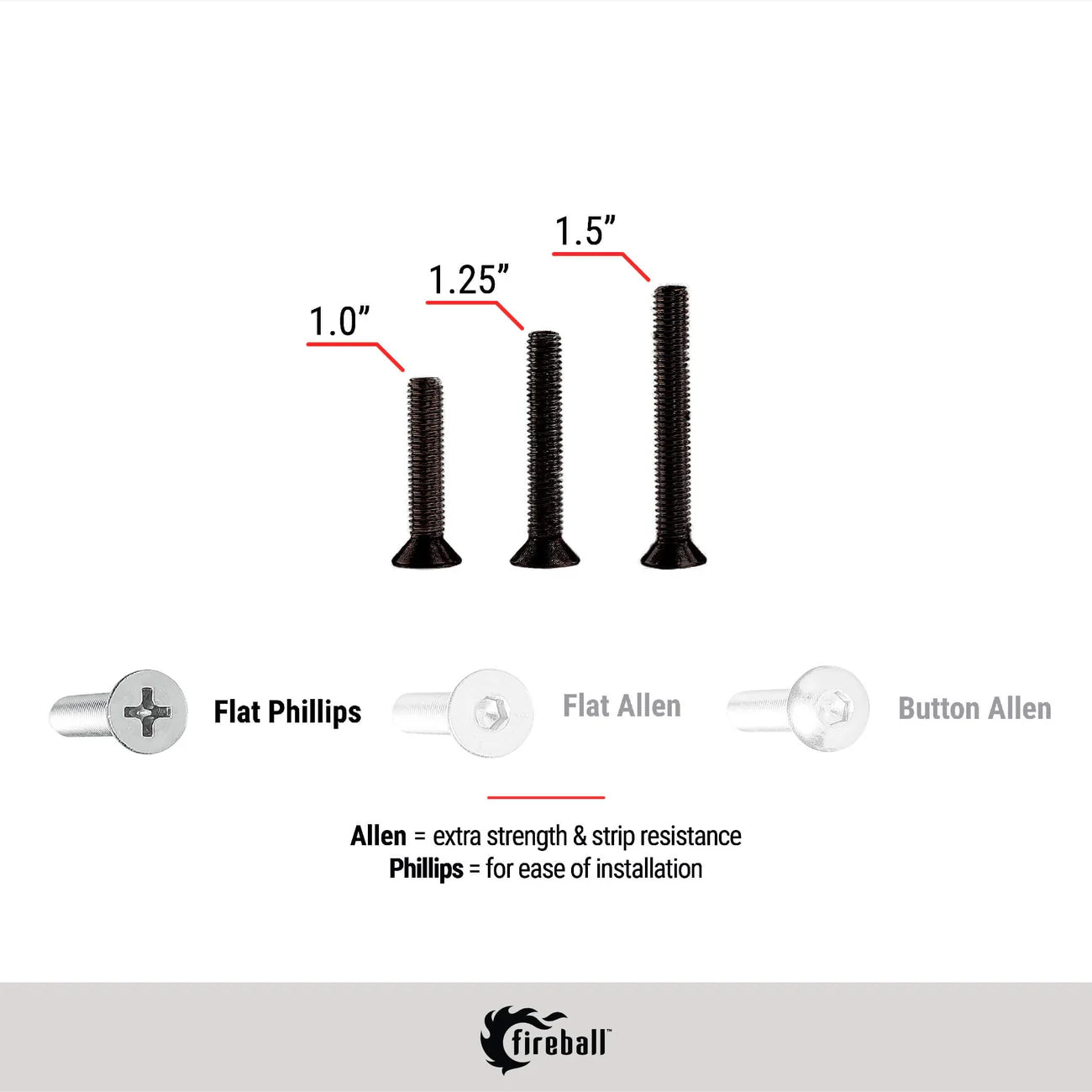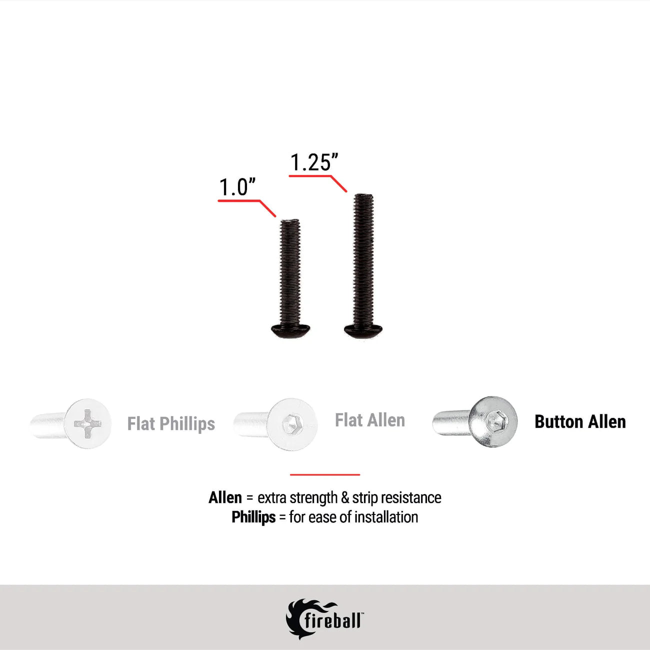 BUTTON ALLEN - Sits atop the deck or trucks, rather than countersunk like the Flat Allen and Flat Phillips. Requires a 1/8”allen bit or driver. Comes with stainless steel washers to prevent damage to deck or trucks. Works best on drop-thru decks, but still works on top mounted decks. The bolt head can be felt under feet, allowing riders to correct foot placement.