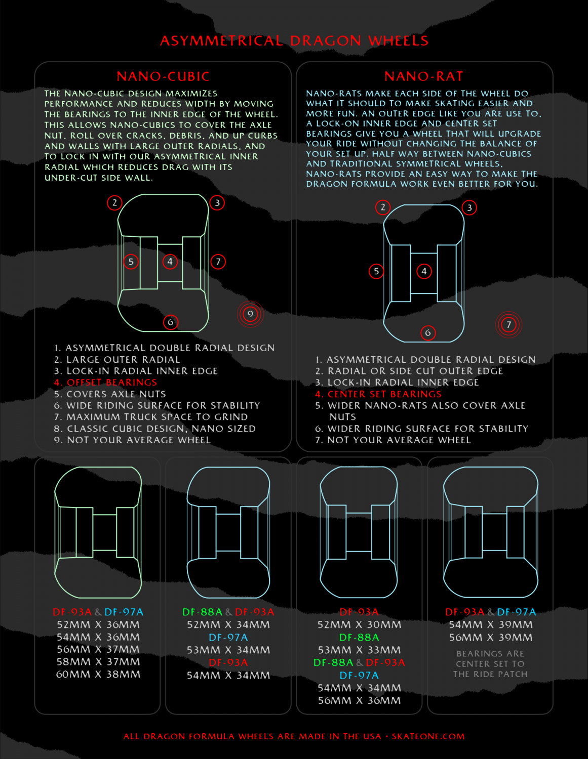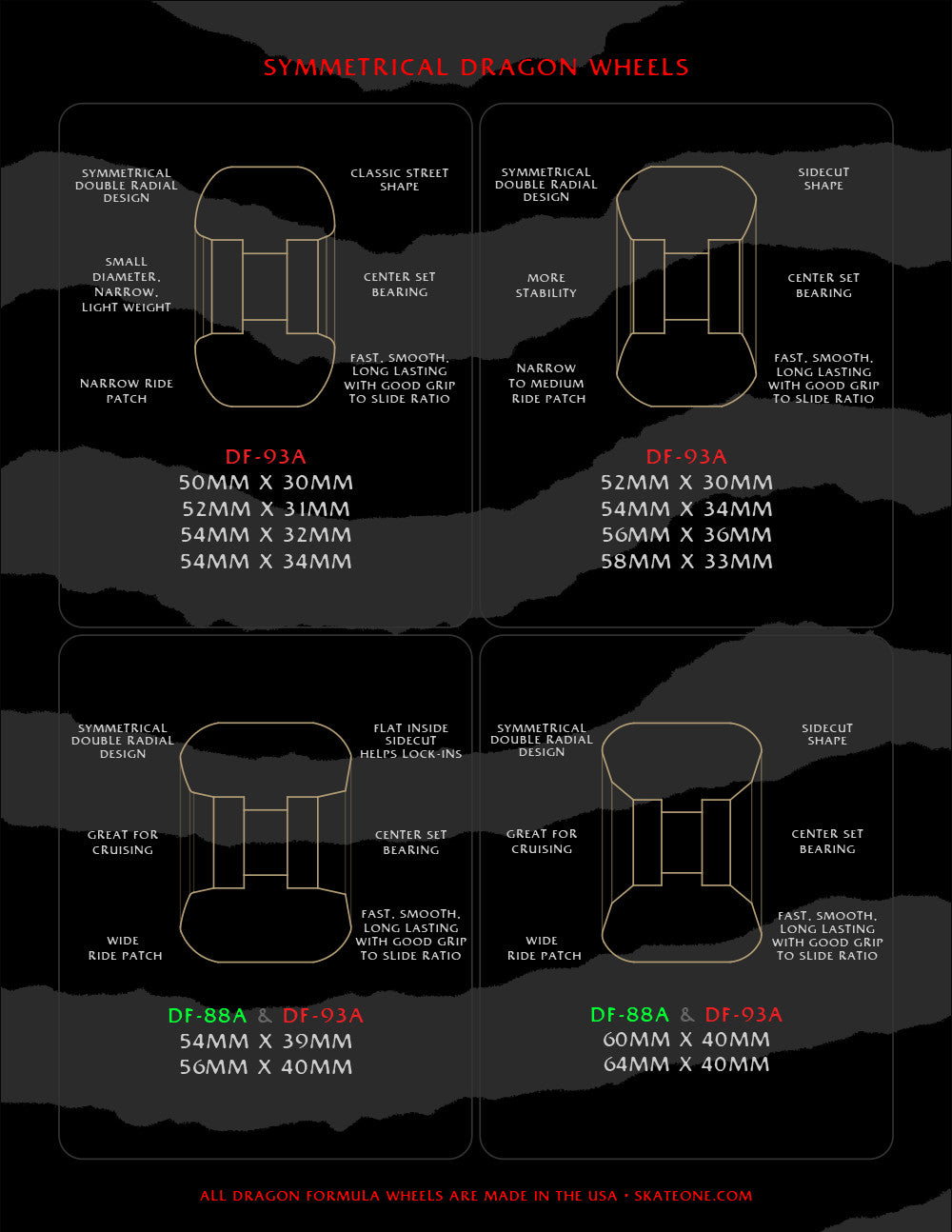 As the third member of the revolutionary Dragon Formula family, DF-88 joins the 93A and 97A options. Dragons let you fine-tune your ride for any terrain while still maintaining the ability to slide, eliminating the need to switch between soft and hard wheels when skating your favorite spots. They make skating more fun, easier on your body, and are sure to become your go-to wheels for all-around skating.